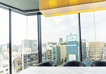 テーブルや椅子一つひとつにこだわり、高級感を演出。上品な照明が、重厚感あふれる光で温かく照らします。窓からの眺望の美しさは、最上階ならでは。気分転換に、仕事中の休憩に、仕事後の癒しの場に、思わず訪れたくなるラウンジです。